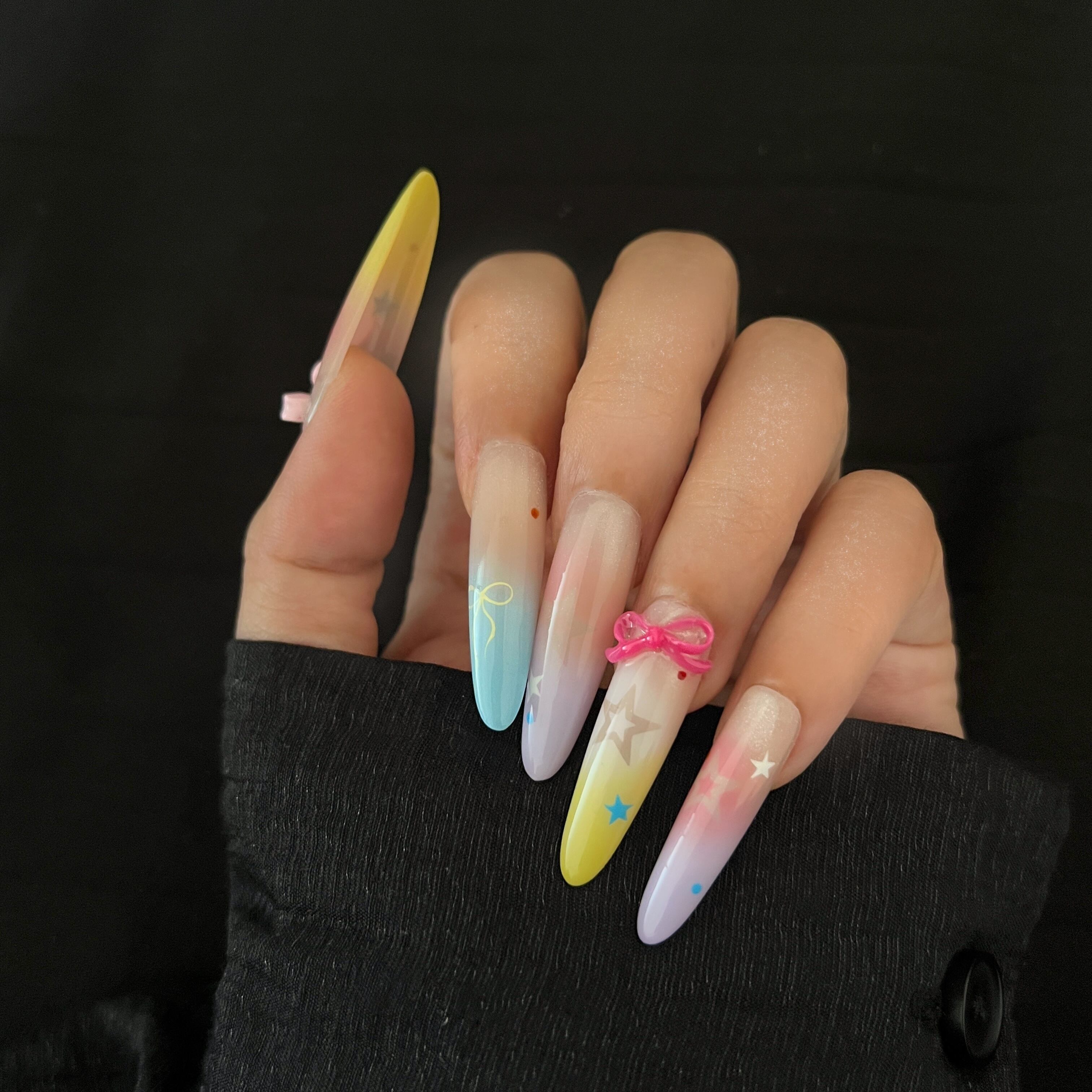 繊細なグラデーションに、星やリボンのモチーフをあしらった手描きネイルチップ。透明感のあるカラーリングと立体的な装飾が、指先に上品な華やかさを添えます。