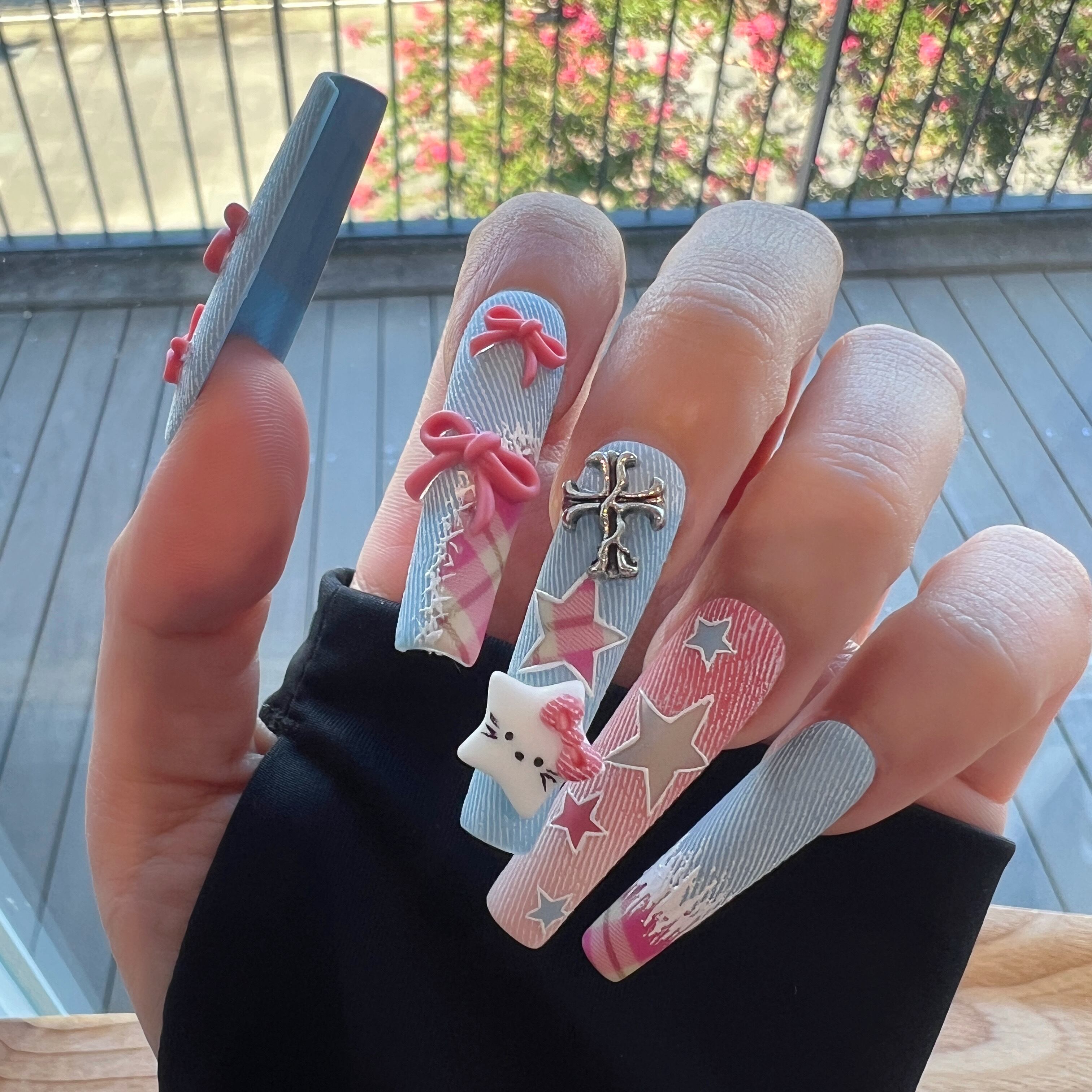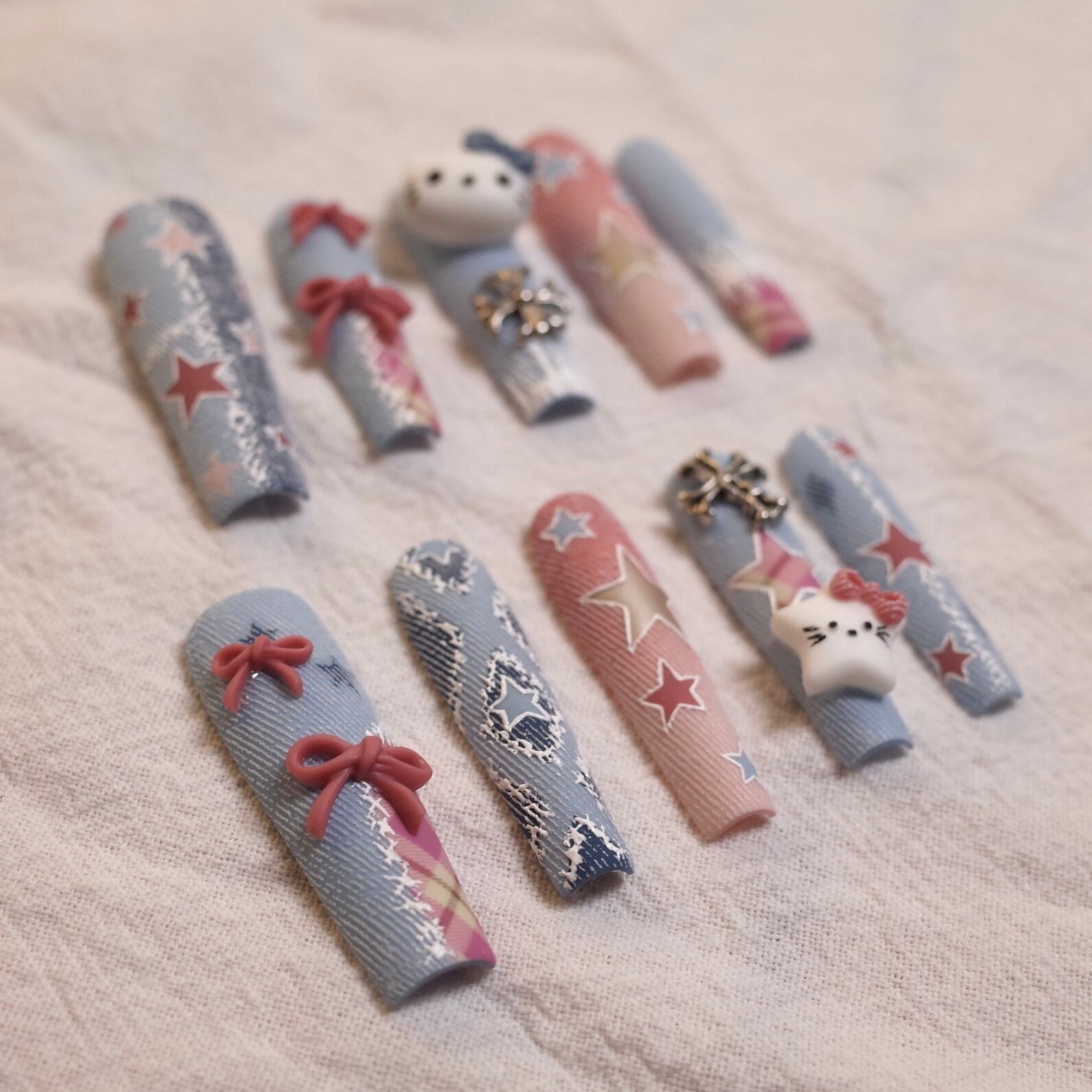 デニムの質感をリアルに再現した、唯一無二の個性派ネイルチップ「Denim Kitty」。立体的なリボンやキティちゃん、星柄の組み合わせで、まるでポップアートのような存在感を放ちます。表面の質感はまるで本物のジーンズ生地のように繊細で、細部までこだわり抜いた最高の仕上がり。どこから見ても“かわいくてかっこいい”を両立した、主役級のデザインです。