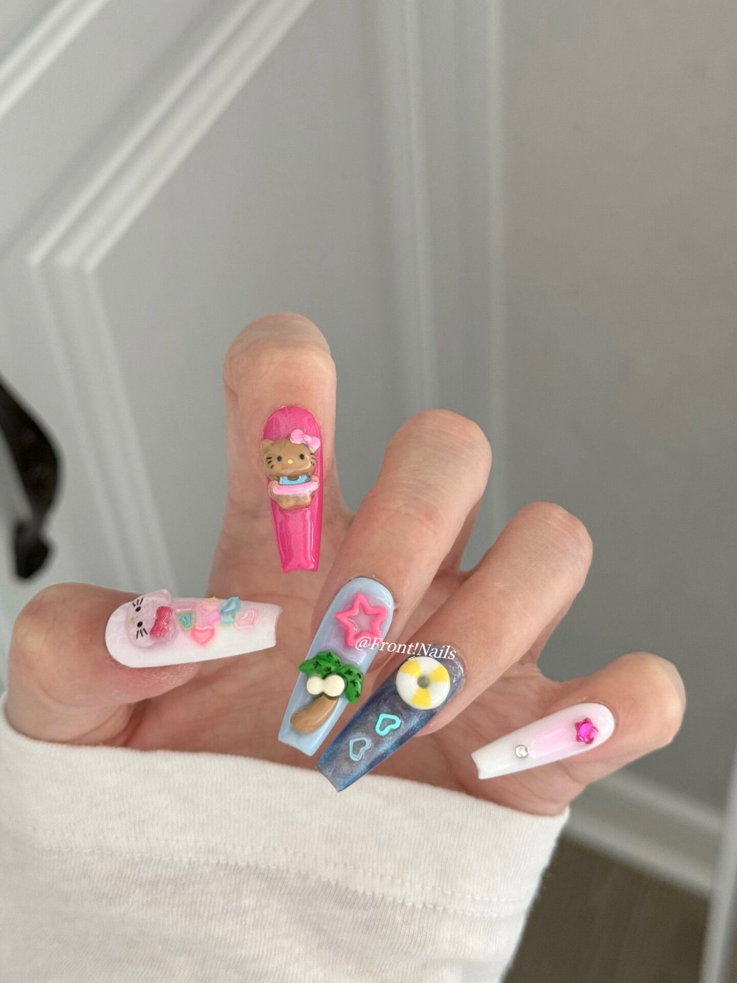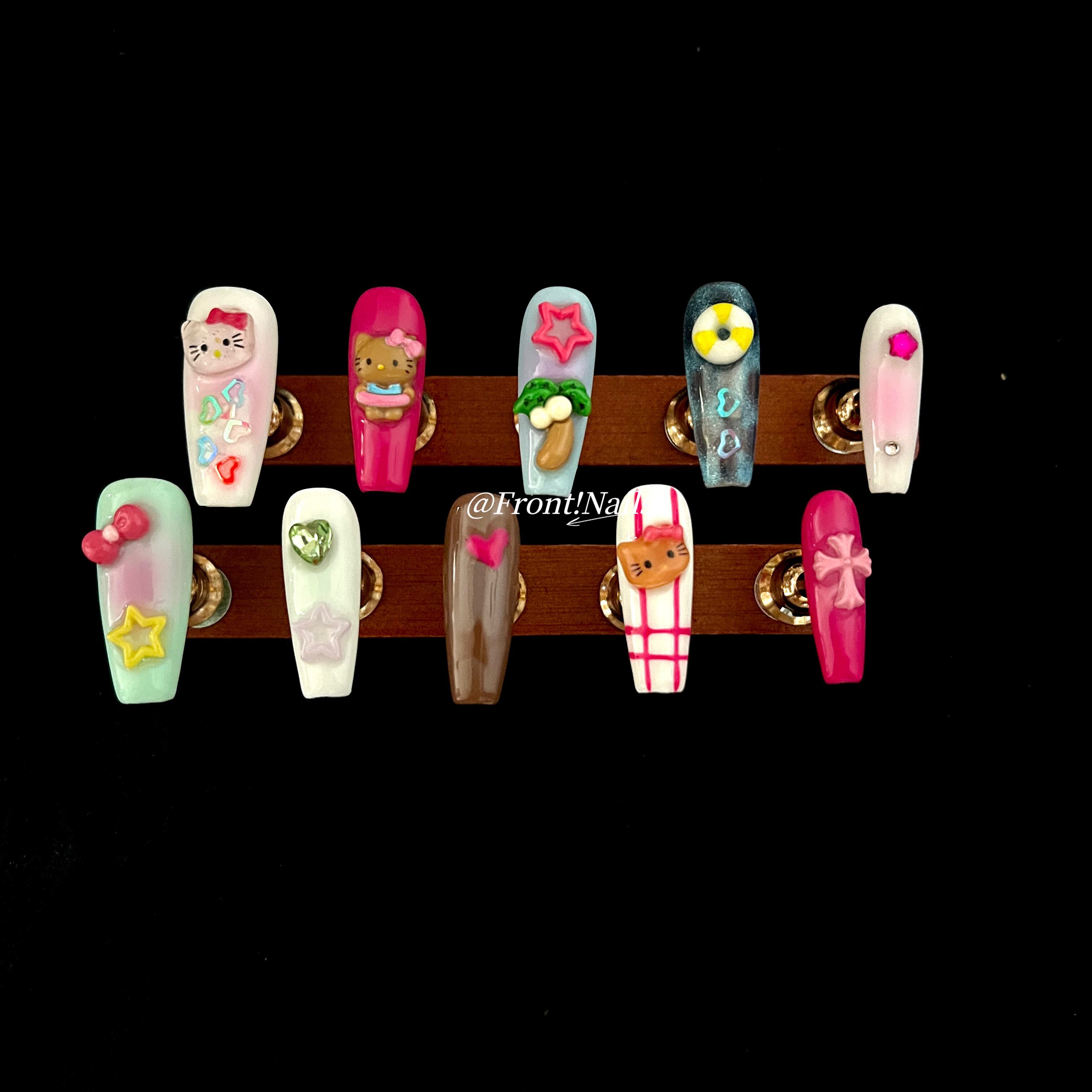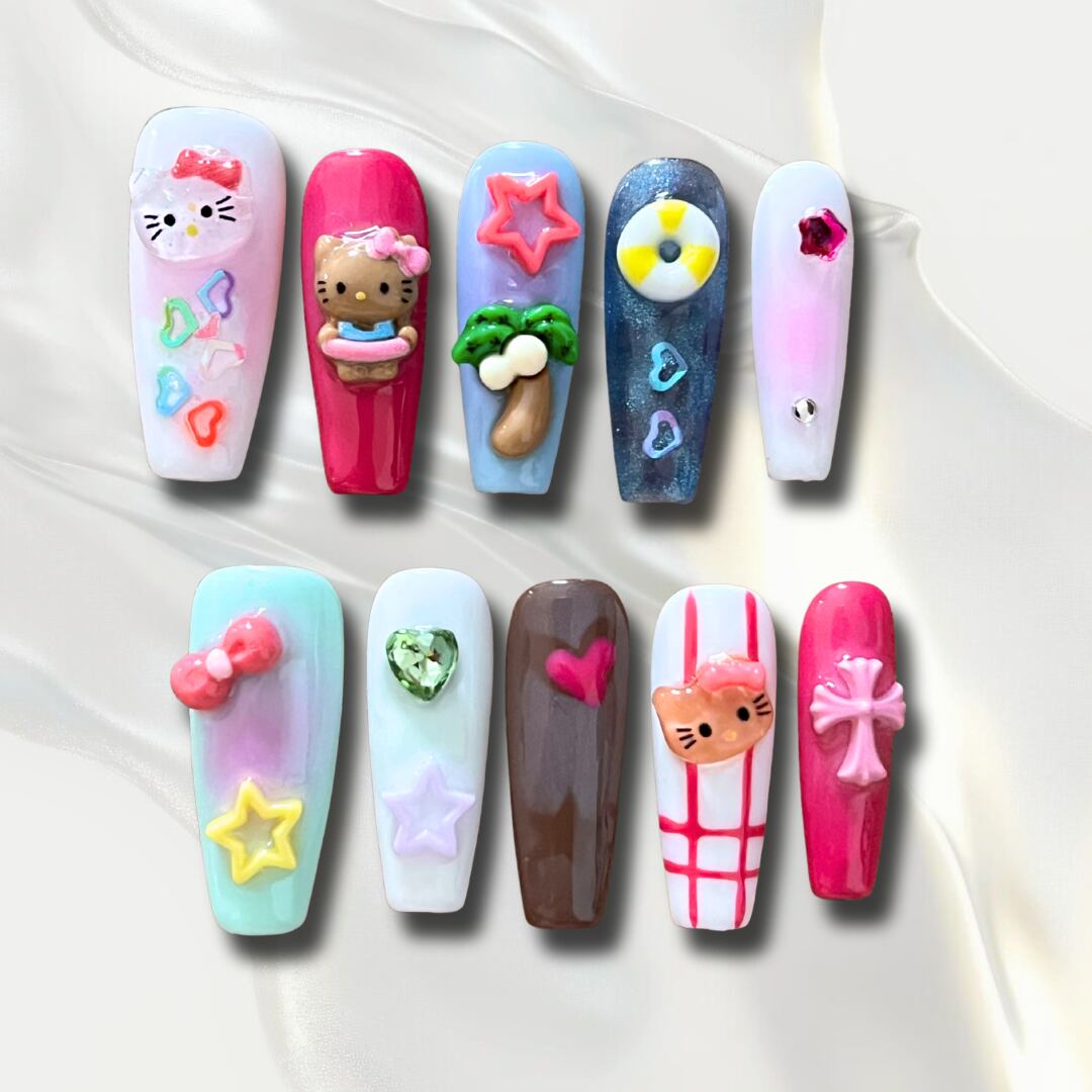 カラフルで元気いっぱいの日焼けキティネイルチップ。気分まで明るくなる、毎日がもっと楽しくなるカラフルネイルです。